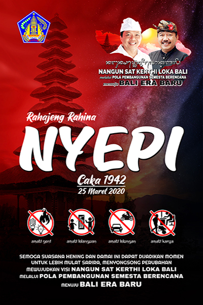 Pemerintah Provinsi Bali Mengucapkan: Rahajeng Rahina Nyepi Tahun Baru Çaka 1942 (Rabu 25 Maret 2020). Semoga di Dalan Suasana Hening dan Damai ini Dapat Dijadikan Momen untuk Lebih Mulat Sarira, Menyongsong Perubahan Menuju Visi “Nangun Sat Kerthi Loka Bali” melalui Pola Pembangunan Semesta Berencana menuju Bali Era Baru.