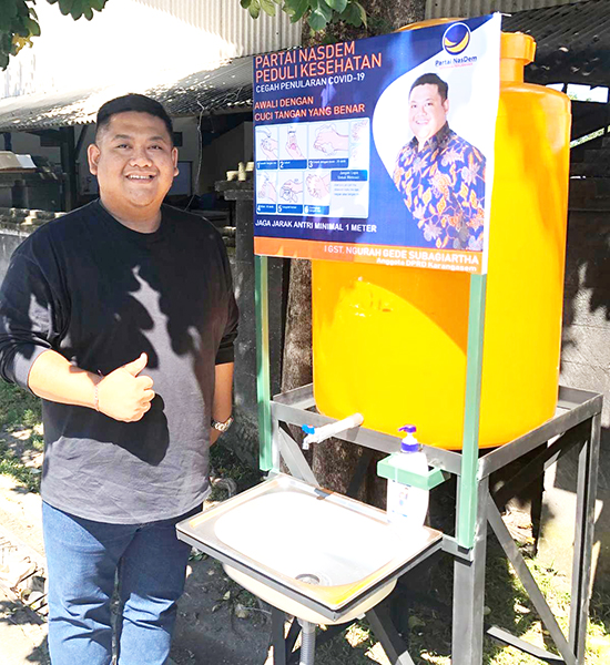 AMLAPURA (CAHAYAMASNEWS). Penyebaran Covid-19 kian hari semakin meluas dan berbahaya. Semakin hari korban terus berjatuhan, bahkan sejumlah tenaga medis pun juga mulai menjadi korban keganasan virus tersebut. Karenanya, berbagai upaya terus dilakukan untuk memutus mata rantai penyebaran Virus Corona (Covid-19), baik dengan cara menyebarluaskan imbauan dan Surat Edaran (SE) maupun melakukan penyemprotan desinfektan pada tempat-tempat yang banyak dikunjungi masyarakat. Tak hanya pemerintah sejumlah masyarakat pun ikut berpartisipasi untuk membantu pemeritah mempercepat usaha dalam memutus mata rantai virus tersebut dengan melakukan berbagai upaya nyata. Seperti halnya yang dilakukan politisi muda I Gusti Gede Subagiartha. Dimana rasa kepeduliannya itu ditunjukkan dengan aksi nyata yakni dengan mendirikan sedikitnya 5 titik tempat cuci tangan (wastapel) dengan kapasitas 250 hingga 500 liter, Selasa (24/3/2020).