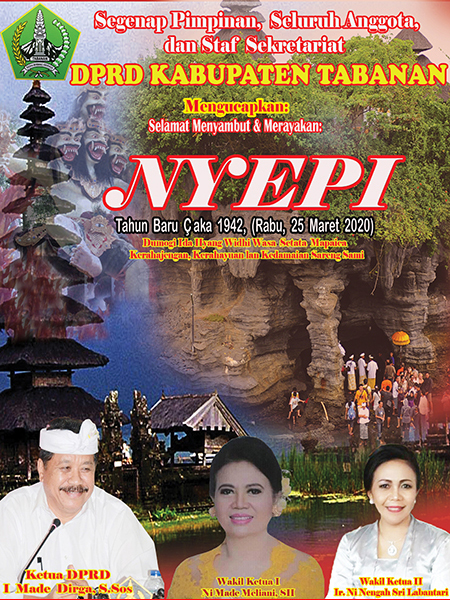 Advetorial Segenap Pimpinan dan Anggota DPRD Kabupaten Tabanan Mengucapkan: “Selamat Hari Raya Nyepi Tahun Baru Çaka 1942 (Rabu 25 Maret 2020). Facebook Comments Tags: Pimpinan dan Anggota DPRD Kabupaten Tabanan Mengucapkan: “Selamat Hari Raya Nyepi Tahun Baru Çaka 1942 Post navigation Previous Previous post: Bantu Pemerintah Antisipasi Penyebaran Virus Corona Kian Meluas, Desa Adat Kerobokan mempunyai Inisiatif Lakukan Penyemprotan secara SwadayaNext Next post: Bendesa Alitan Majelis Desa Adat (MDA), Kecamatan Kuta Utara, Badung Mengucapkan: Rahajeng Nyanggra Rahina Nyepi Tahun Baru Çaka 1942 (Rabu 25 Maret 2020).