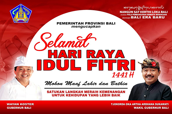 Pemerintah Provinsi Bali Mengucapkan Selamat Hari Raya Idul Fitri. (1 Syahwal 1441 H), Mohon Maaf  Lahir dan Bhatin. Mari Satukan Langkah Meraih Kemenangan untuk Kehidupan yang Lebih Baik.