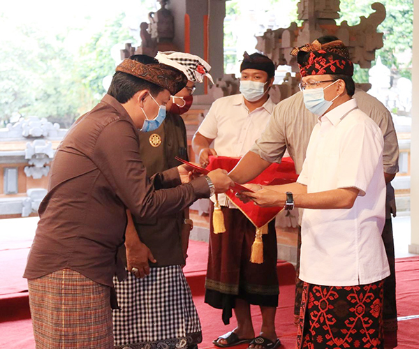 Penyerahan dana bantuan untuk desa adat ini juga dihadiri Bendesa Agung Majelis Utama Desa Adat (MDA) Provinsi Bali Ida Penglingsir Agung Putra Sukahet. *** Cahayamasnews.com/Hms-Tim.