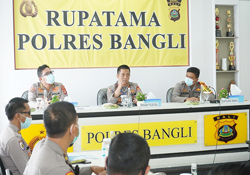 Kedatangan Irwasda Polda Bali Kombes Pol Awang Joko Rumitro, S.I.K.,M.Si bersama Ketua Monev Kombespol I Gede Adhi Mulyawarman, S.I.K.,M.H., dalam rangka Monitoring dan Evaluasi penanganan Covid-19 di wilayah Bangli. Kapolres Bangli AKBP I Gusti Agung Dhana Aryawan, S.I.K.,M.I.K., dalam sambutannya menyampaikan situasi di Kabupaten Bangli dan langkah-langkah yang telah ditempuh dalam rangka penanggulangan Covid-19 bersama jajaran akan terus menerus mengingatkan serta mendisiplinkan masyarakat untuk selalu mematuhi protokol kesehatan guna meminimalisir serta memutus penyebaran Covid-19.