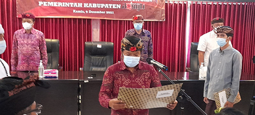 BANGLI (CAHAYAMASNEWS.COM). Bupati Bangli Sang Nyoman Sedana Arta melantik sejumlah pejabat Eselon III dan IV di lingkungan Pemerintah Kabupaten Bangli, Kamis (9/12/21). Kegiatan yang dilaksanakan di Ruang Krisna Setda Kabupaten Bangli ini juga dihadiri oleh Wakil Bupati Bangli I Wayan Diar,Ketua DPRD Kabupaten Bangli I ketut Suastika,Sekda Bangli Ida Bagus Gde Giri Putra serta jajaran Kepala OPD di Lingkungan Pemerintah Kabupaten Bangli.