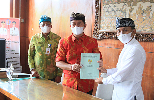 Disamping penyerahan sertifikat PTSL, Bupati Suwirta juga menyerahkan ibah pinjam pakai berupa Dron untuk BPN Klungkung.