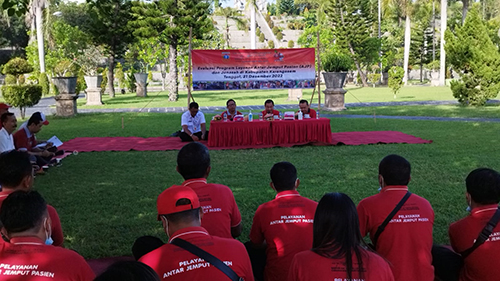 AMLAPURA (CAHAYAMASNEWS). Bupati  Karangasem I Gede Dana melaksanakan  evaluasi jalannya program Antar Jemput Pasien (AJP) dan Jenazah, dilaksanakan di Taman Soekesada, Ujung, Karangasem, Rabu (21/12/2022). Evaluasi yang digelar dengan santai duduk lesehan itu dihadiri seluruh  tenaga AJP didampingi oleh camat. Juga dihadiri oleh Dinas Kesehatan, Bapelitbangda dan BBKPSDM Karangasem.