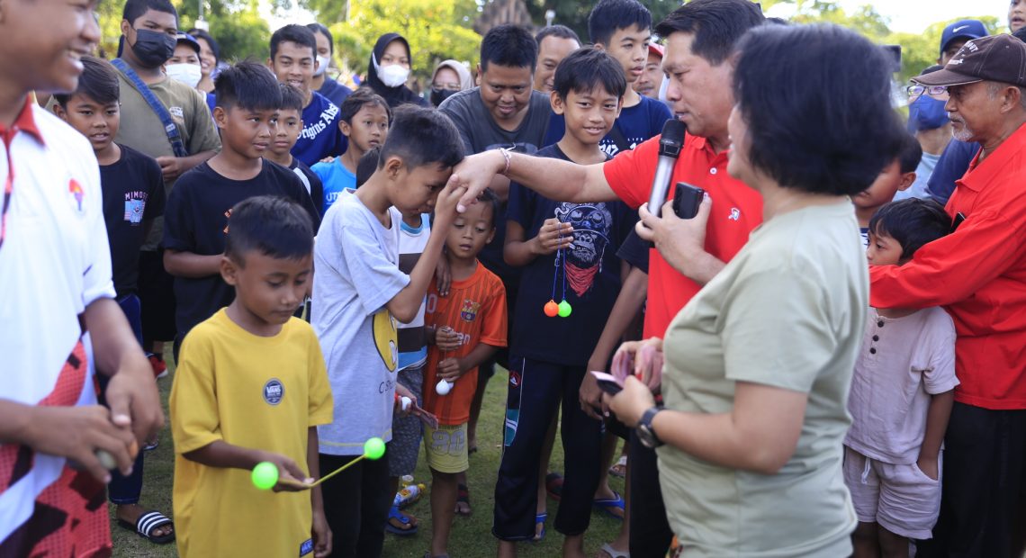 SEMARAPURA (CAHAYAMAS-NEWS). “Boleh bermain, tetapi ingat kewajiban sebagai seorang anak dan sebagai seorang pelajar,” pesan Bupati Klungkung I Nyoman Suwirta didampingi Ny. Ayu Suwirta kepada generasi muda Kabupaten Klungkung, saat menyerahkan hadiah kepada pemenang kegiatan bermain Lato-Lato yang diselenggarakan pada kegiatan Car Free Day di Alun-Alun Ida Dewa Agung Jambe, Minggu (8/1/2023).