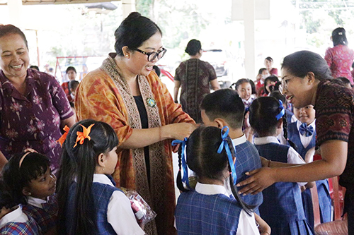 Kedatangan Bunda PAUD yang saat itu didampingi oleh Kepala Dinas Pendidikan, OPD terkait di lingkungan Pemkab Tabanan, Camat dan Perbekel setempat serta, Bunda Paud Kecamatan dan Bunda Paud Desa, disambut riuh ramai Siswa TK Negeri Kediri yang begitu antusias. Nampak juga saat itu Kepala Sekolah TK Negeri Kediri, Guru beserta jajaran, juga orang tua siswa yang kebetulan saat itu mendampingi anaknya.