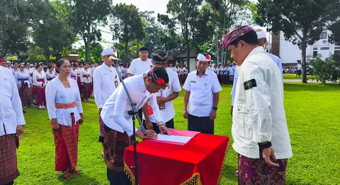 BANGLI (CAHAYAMASNEWS.COM)=Guna meningkatkan kualitas pelayanan, Pemerintah Kabupaten Bangli menggelar upacara pelantikan dan pengambilan sumpah jabatan bagi Pejabat Pimpinan Tinggi Pratama, Jabatan Administrator, Jabatan Fungsional, serta penyerahan SK bagi ribuan Pegawai Pemerintah dengan Perjanjian Kerja (PPPK) Paruh Waktu. Acara berlangsung di halaman Kantor Bupati Bangli Selasa (30/12/2025).