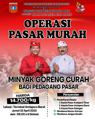 AMLAPURA (CAHAYAMASNEWS). Dalam rangka menjaga ketersediaan pasokan serta stabilisasi harga minyak goreng sawit (minyak curah) di pasar tradisional Kabupaten Karangasem menjelang hari Raya Keagamaan (Idul fitri dan Galungan-Kunianga), Pemerintah Kabupaten Karangasem melalui Dinas Koperasi, Usaha Kecil dan Menengah, Perindustrian dan Perdagangan (Diskopperindag) Kabupaten